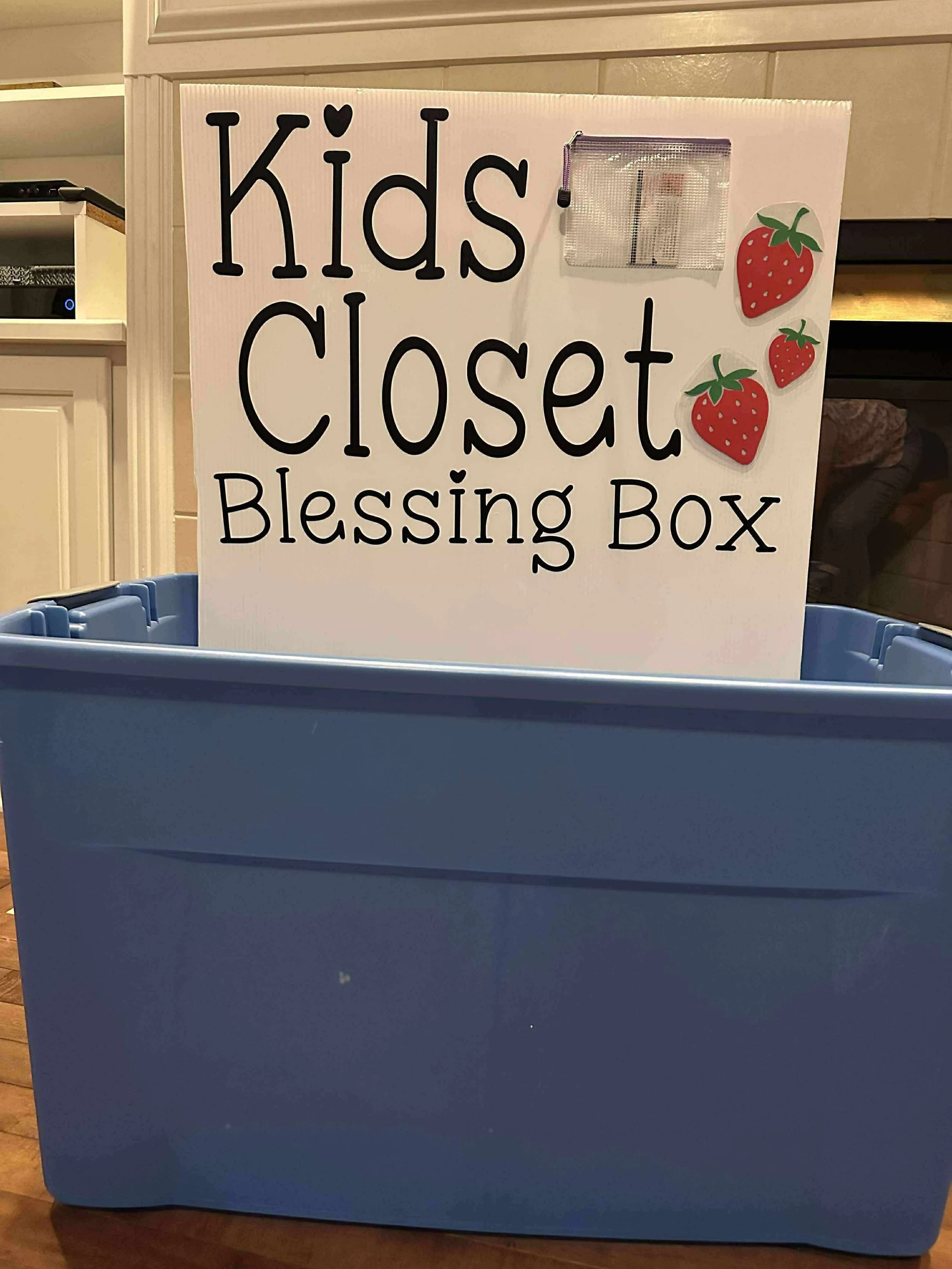 The traveling Blessing Box was created by Lisa Tyler. It goes around to area festivals and community activities. Everything inside is free to whomever needs it. Lisa and our board member Rita Rothenberger came up with the strawberries on the board. (for the Strawberry Festival) Such a cute idea! Rita also does TONS of laundry for us! It’s a group effort!